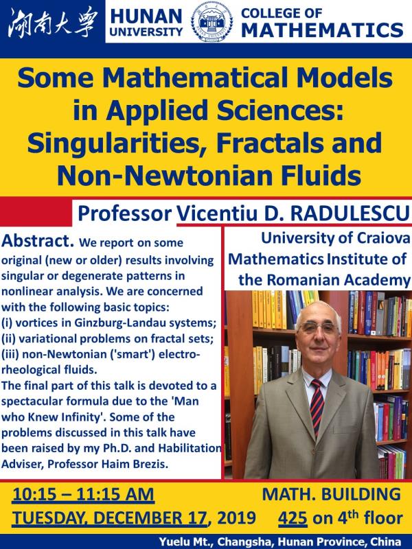 报告题目:Some mathematical models in applied sciences: singularities, fractals and non-Newtonian fluids